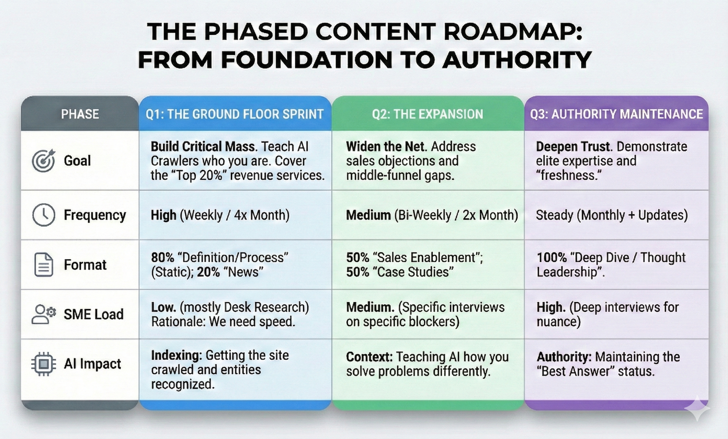 To achieve this speed, we will assign these topics a "strategic, high leverage SME load," focusing on static "Definition and Process" pages we can write via desk research.